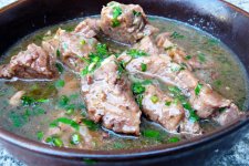 1.Umyte i oczyszczone mięso kroimy w duże kawałki, po czym doprawiamy solą, pieprzem i oprószamy mąką; tak przygotowane kawałki łopatki smażymy na silnie rozgrzanym oleju na złoty kolor z każdej strony, podrumienione mięso przekładamy do miski.