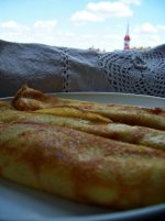 Naleśniki rewelacyjne. Zrobiłam ot tak, bo miałam ochotę na coś słodkiego, a nie chciało mi się piec. Tak, jak dziewczyny napisały - cudnie się smaży, odwraca jeszcze lepiej, jak ktoś ma problemy ze smażeniem, polecam (dlatego pójdą w świat do moich bliskich, które nie potrafią usmażyć zwykłych). Mi wyszło 8, jakoś nie bardzo grubych, z czego zjedliśmy 5 i jesteśmy ogromnie najedzeni. Nadziewałam budyniem czekoladowym Delecty z belgijską czekoladą (http://www.spozywka.pl/n,1657,czteryczwarte_dla_deserow_premium_delecta.html), polewałam sosem czekoladowym z odrobiną brandy. Polecam