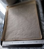 Ciasto rozprowadzić na papierze i upiec płaski placek. (wymiary mojego ciasta : 34 x 44 cm. jeżeli blaszka będzie mniejsza to nic nie szkodzi, ciasto wyjdzie wyższe.