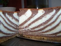 Przez pomyłkę zamiast tortownicy o średnicy 28 cm, wzięłam zgodnie z przepisem tortownicę 26, w związku z czym układ pasków jest inny niż zwykle. Przyznam, że bardziej podoba mi się pasiastość z większej tortownicy. Smaku to na szczęście nie zmieniło... Sernik był bardziej kremowy niż pieczony z chudego twarogu, ale mimo to nadal puszysty.