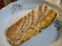 Do połowy ciasta dodałam 1 łyżkę kakao i 2 łyżki kawy rozpuszczalnej(proszek),na spodzie były biszkopty.